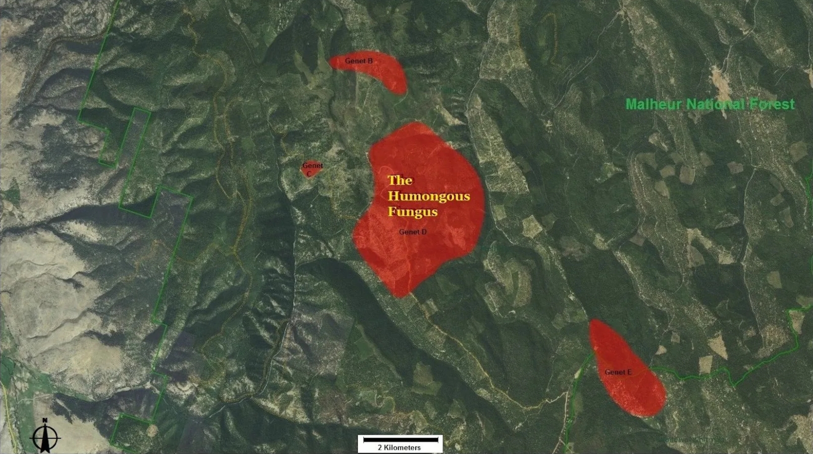 Extent of Armillaria ostoyae in Oregon’s Malheur National Forest. Genets represent different samples. Source: Big Think